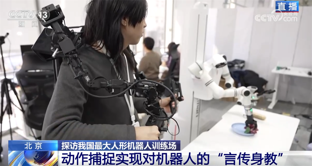 那您可能要問了,老師教學(xué)生講究一個(gè)“言傳身教”,那么,訓(xùn)練師和機(jī)器人之間是怎么交流的呢?您看,這位戴著VR眼鏡、拿著操作手柄的訓(xùn)練師就正在給這臺(tái)機(jī)器人上課。還有您看,當(dāng)訓(xùn)練師按操作鍵時(shí),機(jī)器人的手臂可以移動(dòng)、手指也會(huì)進(jìn)行抓取。還有的訓(xùn)練師會(huì)穿上布滿傳感器的動(dòng)作捕捉衣,讓機(jī)器人可以在更精準(zhǔn)的數(shù)據(jù)指導(dǎo)下進(jìn)行訓(xùn)練。機(jī)器人就是在這些數(shù)據(jù)的傳輸中,一遍一遍模仿,反復(fù)練習(xí),從而提高每個(gè)動(dòng)作的精準(zhǔn)度。