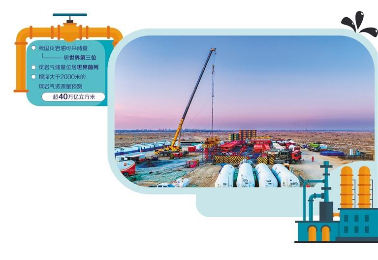 資源稟賦支撐戰(zhàn)略選擇。數(shù)據(jù)顯示,全球頁巖油儲(chǔ)量在11萬億噸至13萬億噸之間,頁巖氣資源量約為456萬億立方米,是當(dāng)前世界常規(guī)天然氣探明總儲(chǔ)量的2倍以上。我國頁巖油可采儲(chǔ)量居世界第三位,頁巖氣儲(chǔ)量位居世界前列,埋深大于2000米的煤巖氣資源量預(yù)測(cè)超40萬億立方米。