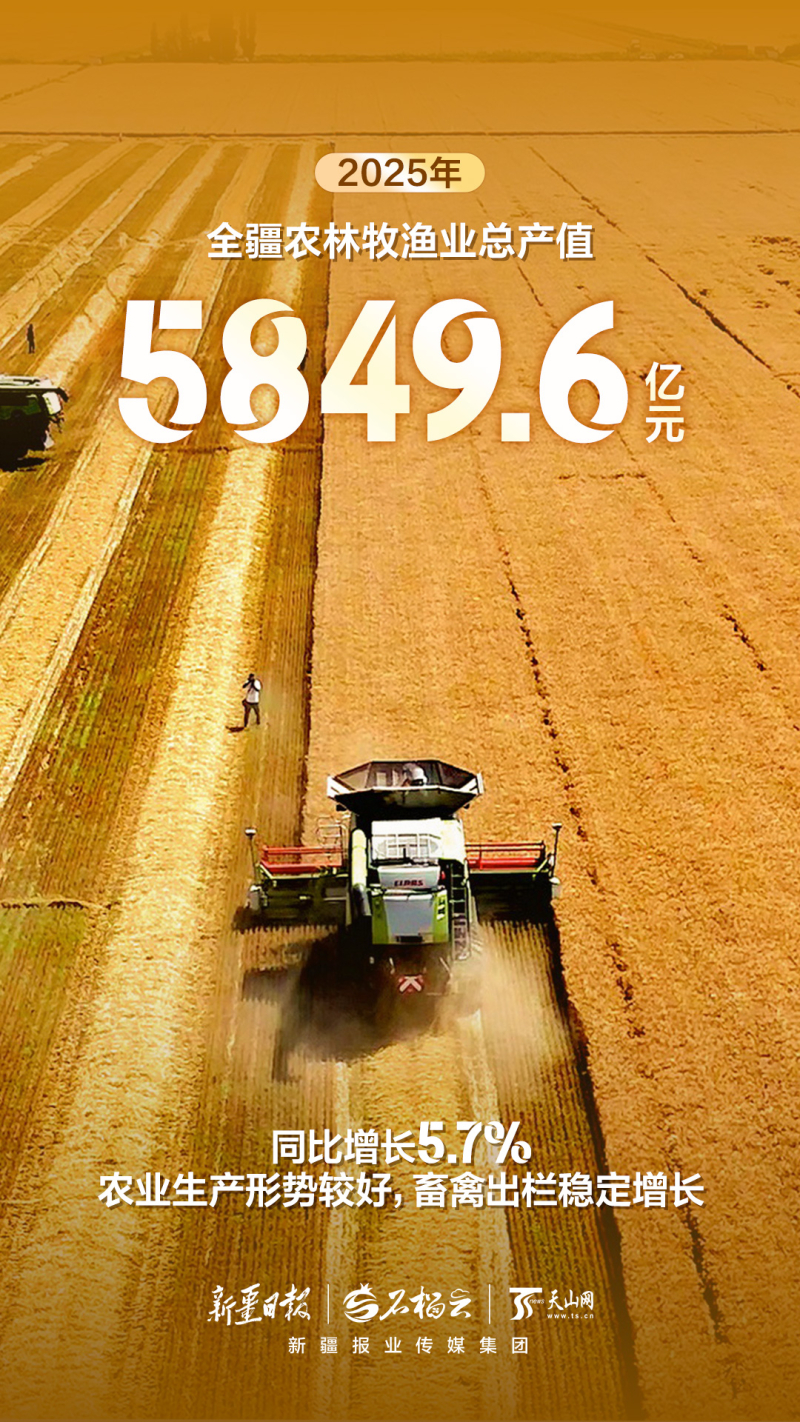 全疆農(nóng)林牧漁業(yè)總產(chǎn)值5849.6億元,同比增長5.7%,農(nóng)業(yè)生產(chǎn)形勢較好,畜禽出欄穩(wěn)定增長。