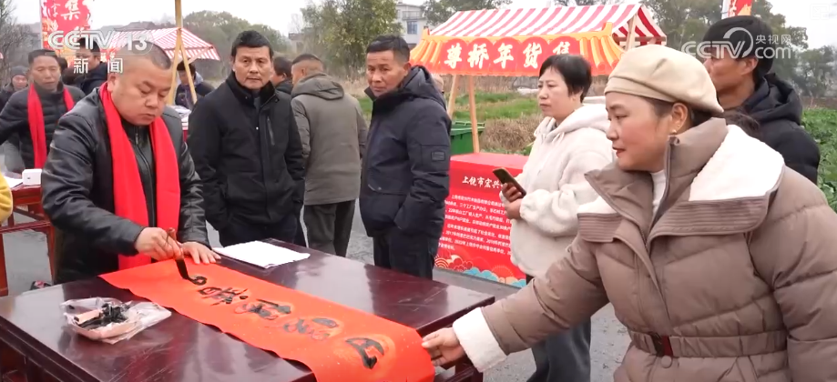 在江西上饒市廣信區(qū)尊橋鄉(xiāng),年貨市集人頭攢動。攤位上年貨品類豐富,當(dāng)?shù)氐臅◥酆谜攥F(xiàn)場寫春聯(lián)、送福字,墨香四溢。