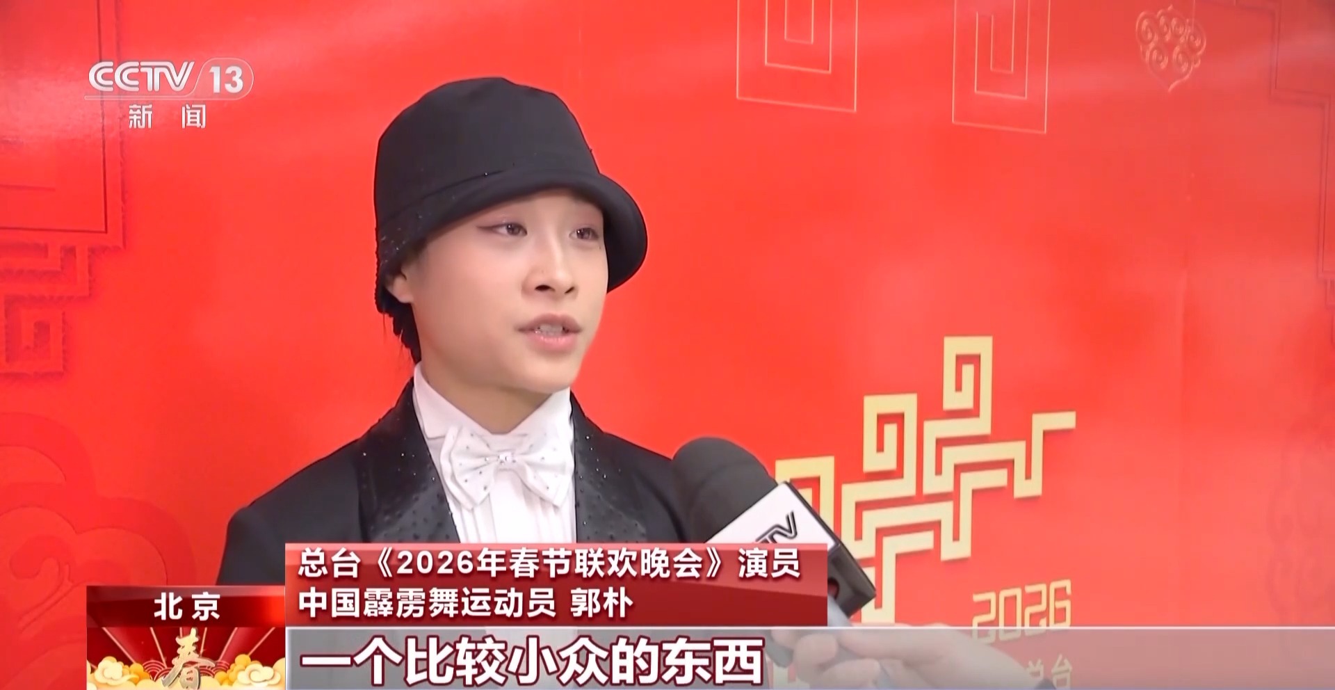 總臺(tái)《2026年春節(jié)聯(lián)歡晚會(huì)》演員 中國(guó)霹靂舞運(yùn)動(dòng)員 郭樸:這次在節(jié)目當(dāng)中做得最多的就是霹靂舞里面的一些技巧難度動(dòng)作,這是我第一次參加央視春晚,在春晚當(dāng)天讓大家看到霹靂舞,很開心,因?yàn)榕Z舞算是一個(gè)比較小眾的東西,它可以帶到全國(guó)人民的眼前,這個(gè)機(jī)會(huì)很難得。