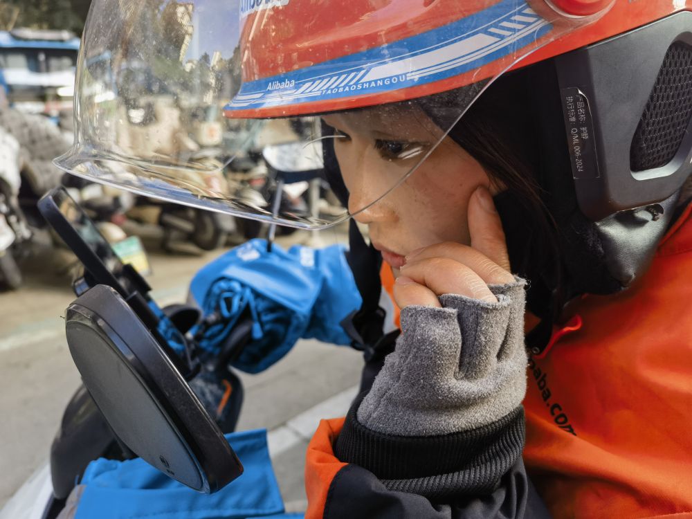 外賣騎手朱亭亭在查看雨雪天氣送餐時(shí)臉上摔出的傷。新華社記者 朱青 攝