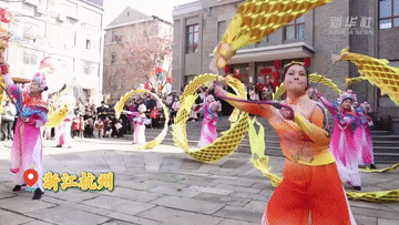 在杭州市余杭區(qū)的瓶窯老街,舞龍、花燈、竹馬等輪番上演,與熱鬧的市集一同營造出濃濃年味,吸引大批市民、游客。