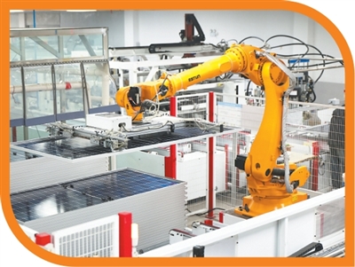 江蘇省淮安市洪澤區(qū)新源太陽(yáng)能科技有限公司,工業(yè)機(jī)器人在生產(chǎn)太陽(yáng)能光伏組件。