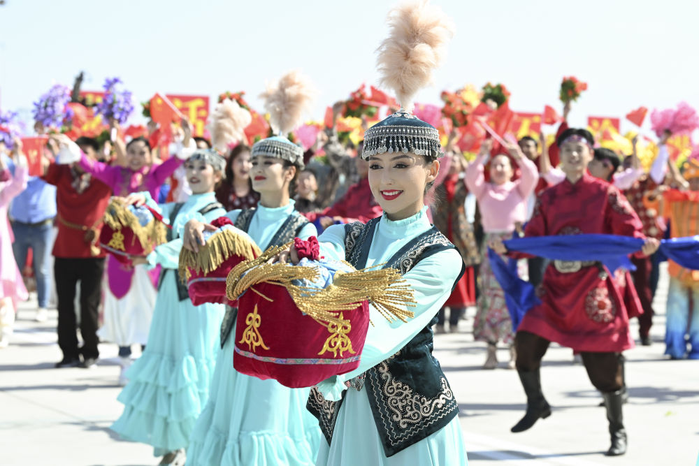 各族群眾代表身著民族服飾,載歌載舞,歡迎習(xí)近平總書(shū)記的到來(lái),表達(dá)對(duì)總書(shū)記的衷心祝福。