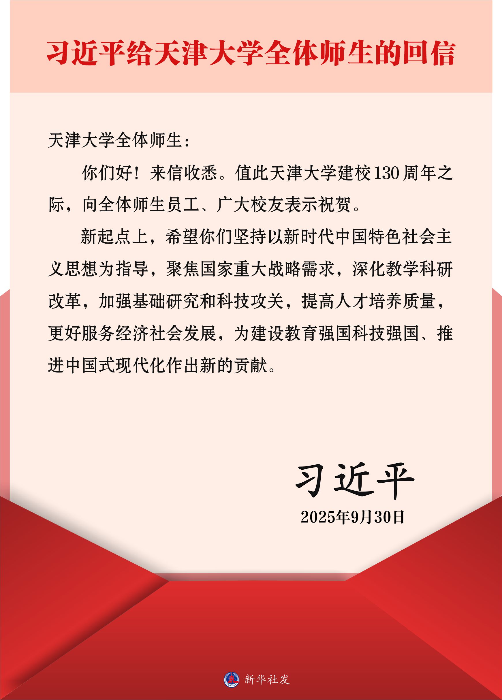 你們好!來信收悉。值此天津大學(xué)建校130周年之際,向全體師生員工、廣大校友表示祝賀。