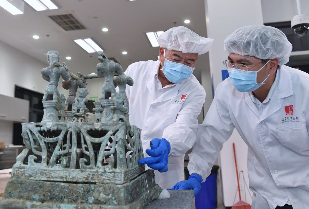 2023年5月30日,在四川三星堆博物館文物保護(hù)和修復(fù)中心,文物修復(fù)師郭漢中(左)與同事討論神壇底座修復(fù)方案。郭漢中從事文物修復(fù)工作已40余年,深度參與了三星堆祭祀坑的發(fā)掘工作,累計(jì)修復(fù)文物6000余件。“大概還有上萬件文物等著修復(fù),需要一代接著一代往下干?!惫鶟h中說,他要把平生所學(xué)傳承下去,培養(yǎng)更多人才。