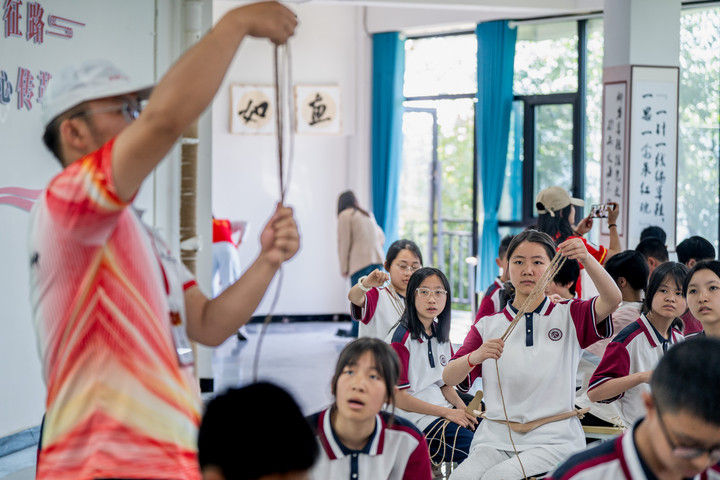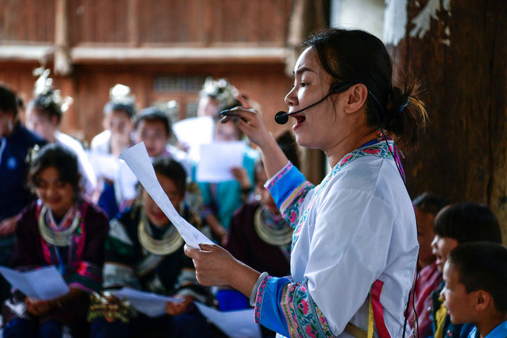 2025年9月26日,內(nèi)蒙古興安盟科右中旗巴彥呼舒第六中學美術教師、非遺代表性傳承人吳斯琴(左四)指導學生刺繡。近年來,內(nèi)蒙古興安盟科爾沁右翼中旗巴彥呼舒第六中學將當?shù)貒壹壏沁z圖什業(yè)圖刺繡引入校園,開設校本課程,并成立興趣社團,在豐富校園文化生活的同時,讓學生們近距離感受非遺的魅力,弘揚和傳承中華優(yōu)秀傳統(tǒng)文化。隨著國產(chǎn)動畫電影《哪吒之魔童鬧?!凡粩嗨⑿轮袊笆菲狈考o錄,參與電影配樂的貴州省榕江縣三寶侗寨的楊想妮和“舞樂蟬歌”團隊為更多人所熟知。樂團成員懷揣“用音樂傳遞侗族文化,讓世界聽見侗族大歌”的共同夢想,將侗族大歌推向更廣闊的舞臺。這是2025年4月22日,楊想妮在貴州省黎平縣肇興鎮(zhèn)廈格侗寨教前來研學的孩子們唱侗歌。