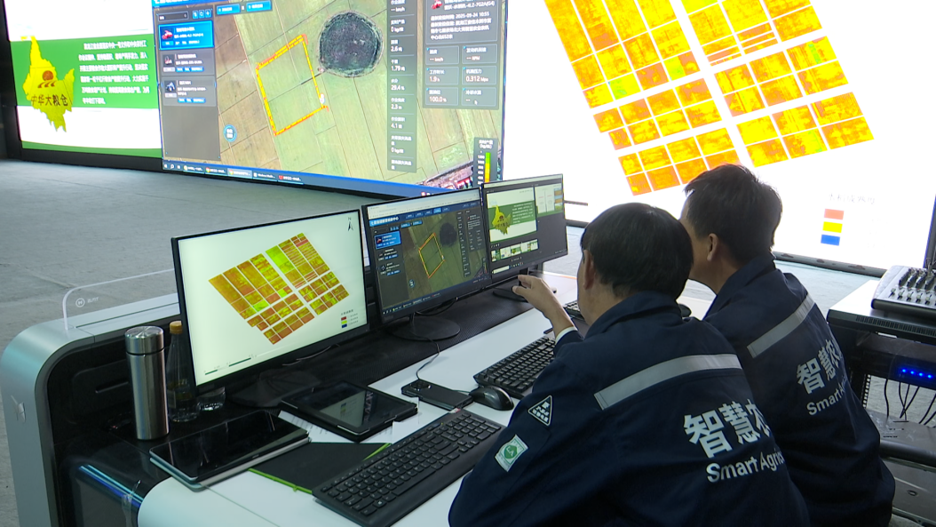 七星農場“科技賦能農業(yè)生產”的場景不僅在田間地頭,還在農場智慧農業(yè)指揮中心的大屏幕上上演。今年,該中心首次投入應用多光譜成像水稻長勢圖,為秋收提供了精準高效的數據支撐?!拔覀兺ㄟ^大數據、人工智能等技術,分析水稻成熟度、未來氣象等,制定收獲排期,讓秋收更為有序?!痹撝笓]中心高級主管王勇說。
