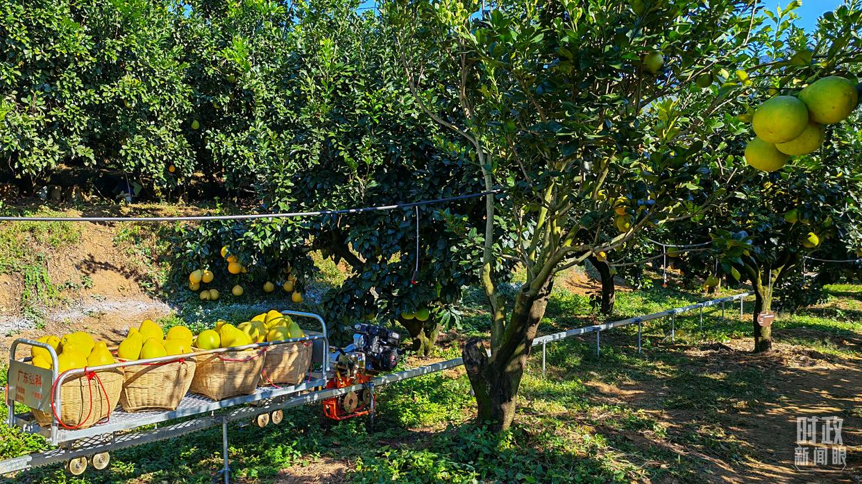 △金柚采摘運(yùn)送用上了無(wú)人軌道車(chē),可大大減輕人力負(fù)擔(dān)。(總臺(tái)央視記者郭鴻拍攝)