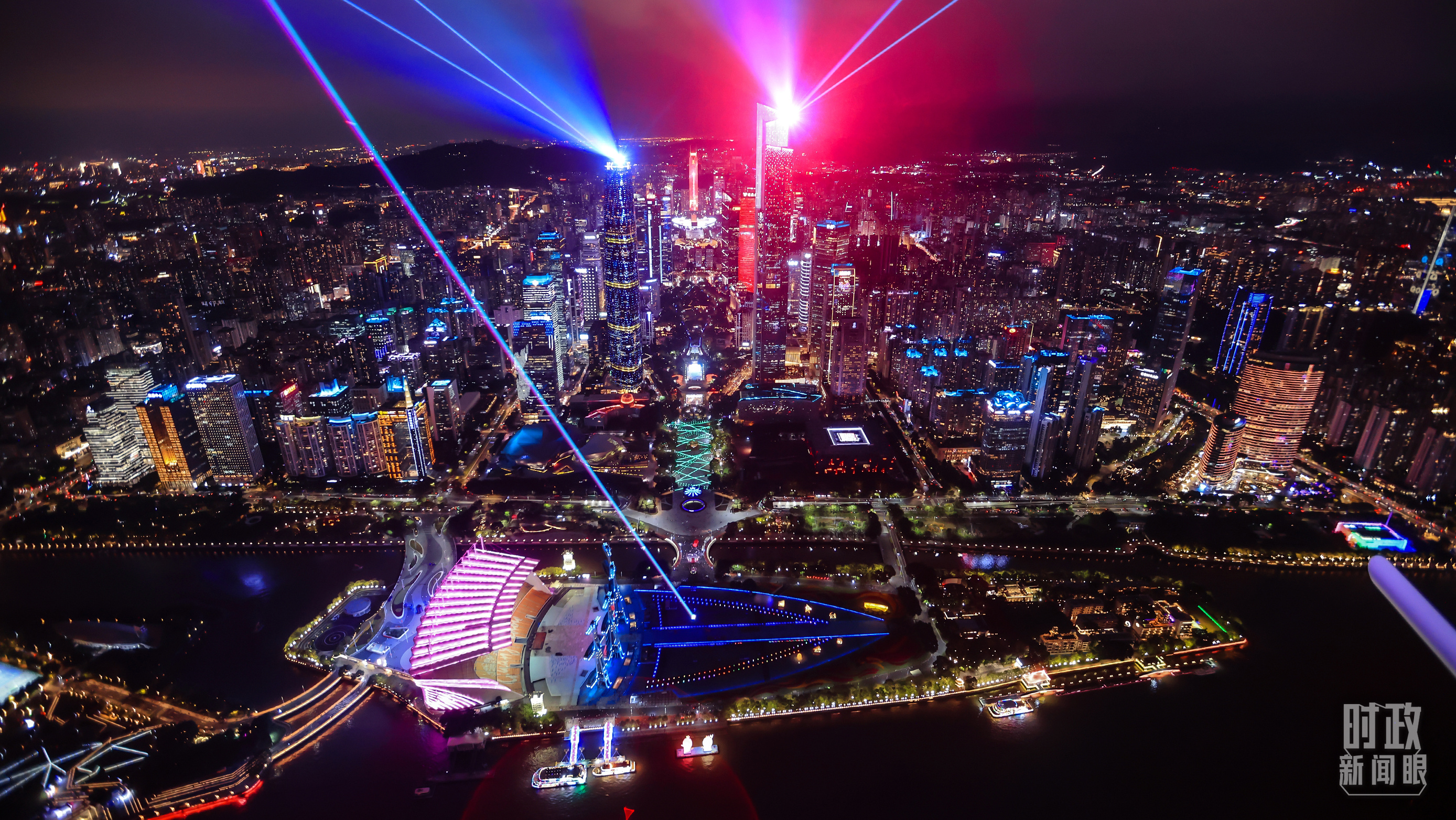 開幕式巧妙融入香港維多利亞港、澳門大三巴、廣州塔等城市地標(biāo)元素,實現(xiàn)粵港澳三地同步升國旗儀式。
