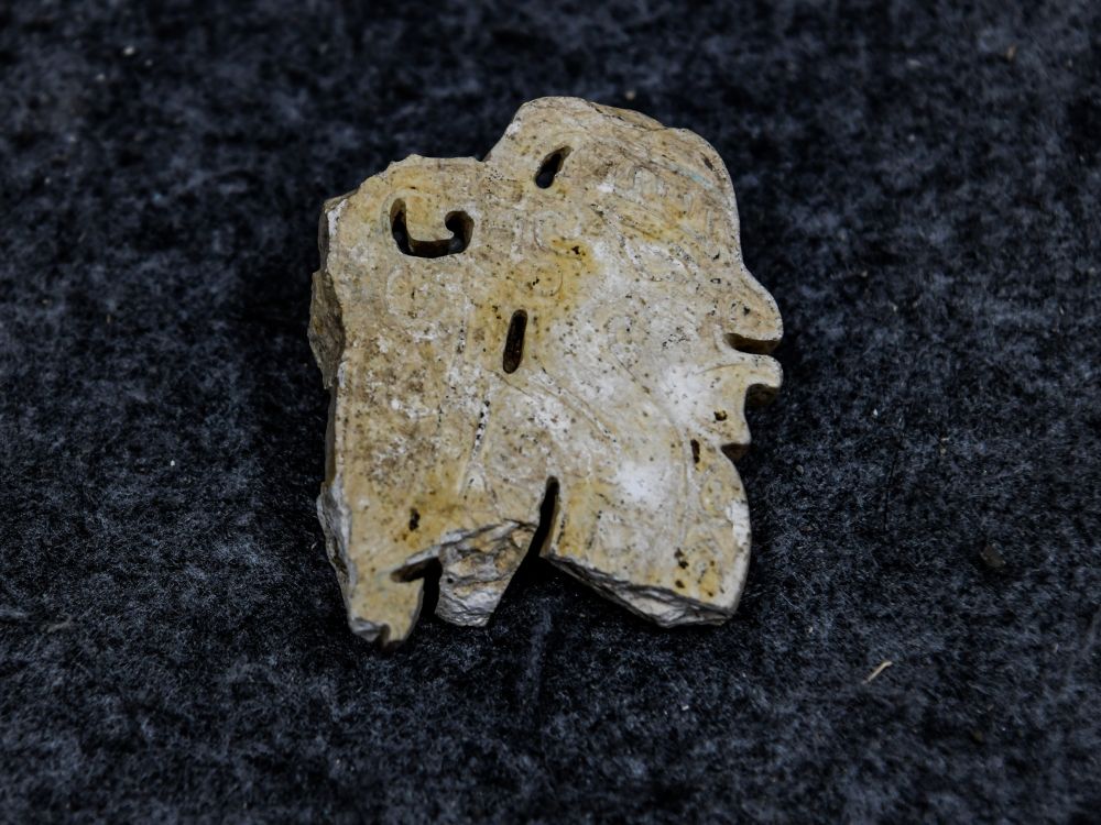 2024年7月10日在四川省文物考古研究院拍攝的三星堆遺址出土的玉石上陽刻的側(cè)身人像。三星堆遺址新發(fā)現(xiàn)與玉石器生產(chǎn)加工相關的遺存,專家初步判斷為玉石器“生產(chǎn)車間”,年代為商代中期,距今約3500年至3400年。