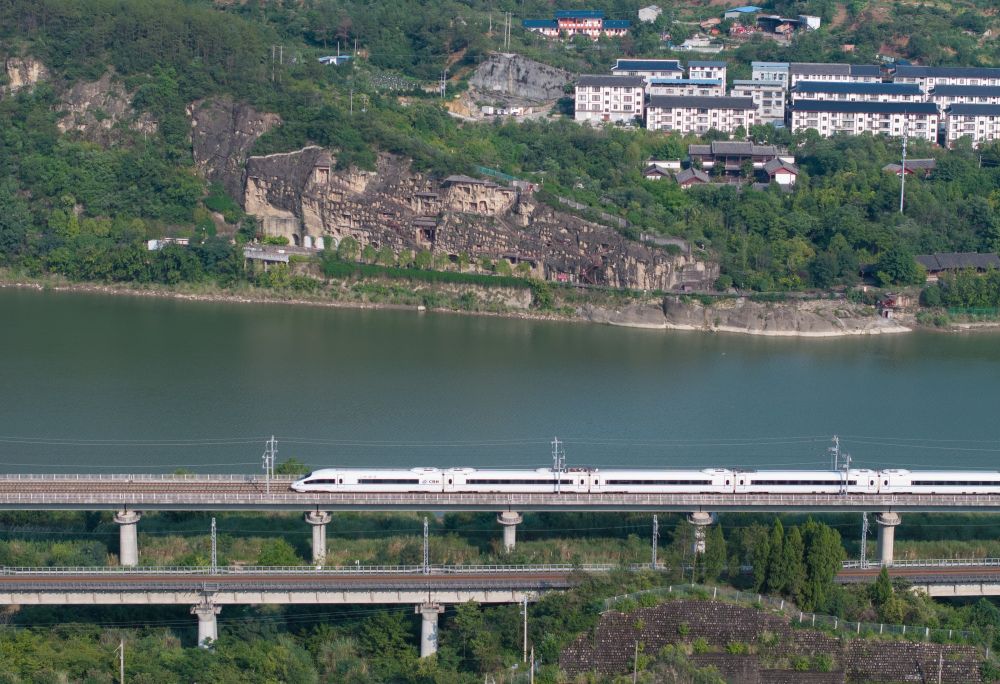 2025年7月18日,在四川省廣元市千佛崖景區(qū)對面的嘉陵江畔,一列高鐵列車運行在西成高鐵上(無人機照片)。千佛崖腳下的金牛古蜀道和對岸的高鐵列車,濃縮成一幅千年蜀道變遷圖。