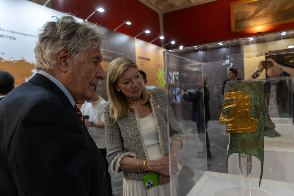 2025年5月13日,觀眾在希臘雅典新斯米爾尼市政博物館參觀“青銅之光——古蜀文明特展”。展覽通過精美的文物復制品、3D打印技術和圖文展示,生動呈現(xiàn)以三星堆—金沙遺址為代表的古蜀文明,吸引眾多當?shù)孛癖娗皝韰⒂^。