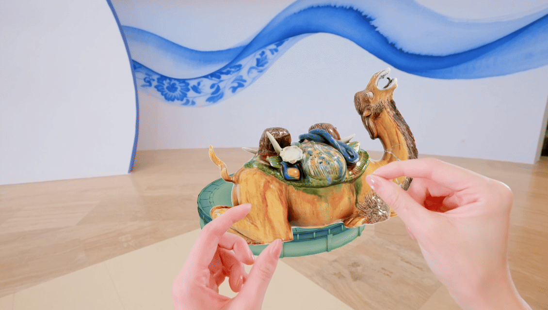 “像這個唐三彩載物臥駝俑,制作惟妙惟肖,能夠讓觀眾了解古絲綢之路商貿(mào)情況。唐三彩載物臥駝俑放在展柜里,背面部分觀眾不易看到。現(xiàn)在通過MR(混合現(xiàn)實)眼鏡,觀眾就可以全方位查看這件文物的各處細節(jié)?!蔽靼膊┪镌簲?shù)字與信息部工作人員李源介紹道。