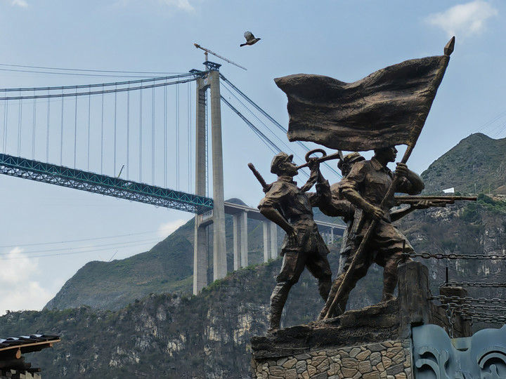 這是2025年4月28日拍攝的貴州花江峽谷大橋。9月28日,新的世界第一高橋——貴州花江峽谷大橋建成通車。近處的則是一座建于1898年、由14根鐵鏈組成的花江鐵索橋。1935年4月,中央紅軍右路縱隊(duì)挺進(jìn)黔西南,死守花江鐵索橋這一戰(zhàn)略要沖,確保紅軍主力順利搶渡北盤江。新舊兩座橋,橫跨著百年歷史風(fēng)云,見證著血與火的艱辛歷程。