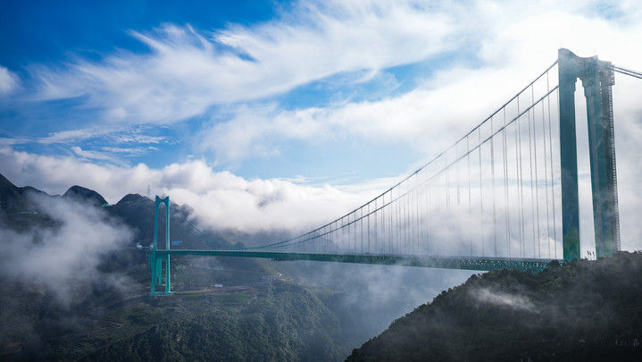 2025年9月28日,世界第一高橋——貴州花江峽谷大橋建成通車?;ń瓖{谷大橋是貴州六枝至安龍高速公路的控制性工程,大橋全長(zhǎng)2890米,主跨徑1420米,是目前世界山區(qū)峽谷第一大跨度鋼桁梁懸索橋;其橋面距水面垂直高度625米,是新的世界第一高橋。