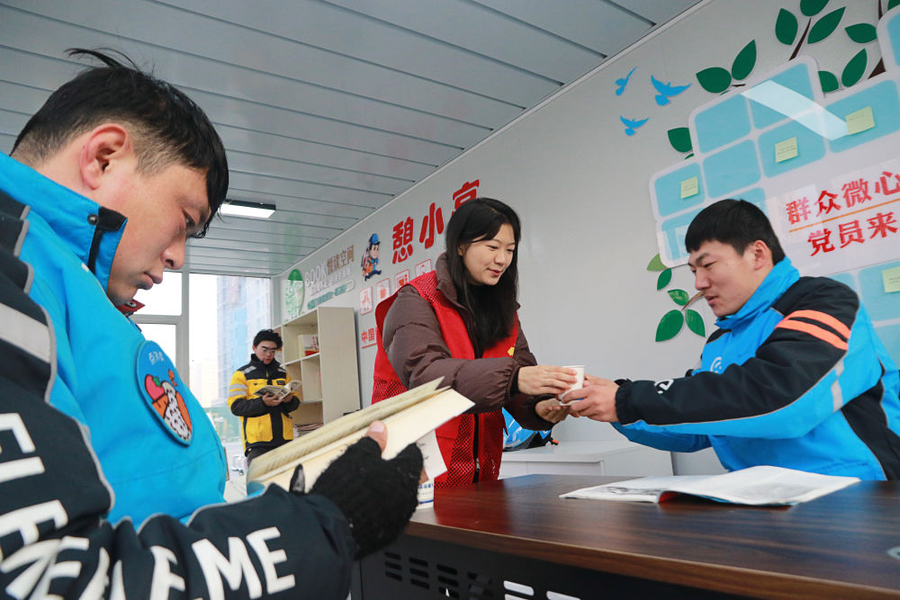 2023年12月27日,志愿者在山東省高密市密水街道“憩小亭”服務(wù)站為外賣騎手送上熱水。入冬以來,山東省高密市密水街道推進“憩小亭”暖心服務(wù)站建設(shè),為外賣騎手、快遞小哥、網(wǎng)約車司機、環(huán)衛(wèi)工人等戶外勞動者提供飲水、無線上網(wǎng)、食物加熱等多項服務(wù),讓他們感受到冬日里的溫暖。