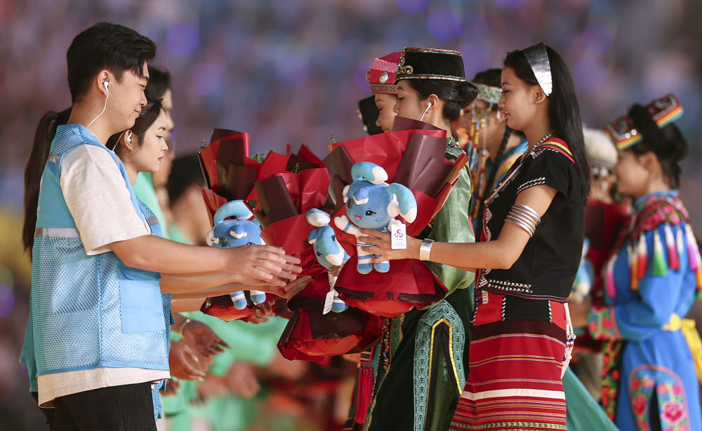2024年11月30日,五十六個民族代表在海南三亞舉行的第十二屆全國少數(shù)民族傳統(tǒng)體育運動會閉幕式上為志愿者獻花。運動會期間,數(shù)千名志愿者“小鹿鹿”奔赴十余個競賽場館、二十多家接待酒店、媒體中心、機場車站等地,為來自全國各地的運動員、技術(shù)官員、工作人員和觀眾提供禮賓接待、交通引導(dǎo)、安全保衛(wèi)等志愿服務(wù)。