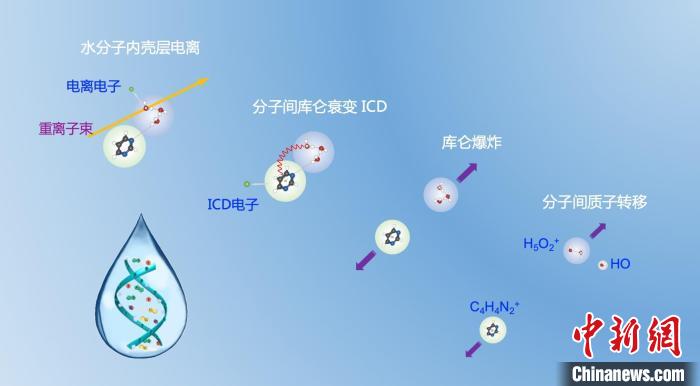 該實(shí)驗(yàn)在蘭州重離子加速器冷卻儲(chǔ)存環(huán)和320千伏高電荷態(tài)離子綜合研究平臺(tái)完成。研究團(tuán)隊(duì)首次觀測(cè)到:當(dāng)重離子輻照水分子時(shí),會(huì)誘發(fā)它和生物分子間的分子間庫侖衰變(ICD)過程;內(nèi)殼層電離的水分子通過ICD將能量傳遞給嘧啶分子,導(dǎo)致嘧啶分子電離并釋放一個(gè)低能電子;ICD過程還會(huì)進(jìn)一步誘發(fā)水分子之間的質(zhì)子轉(zhuǎn)移,產(chǎn)生也具有殺傷力的羥基自由基。