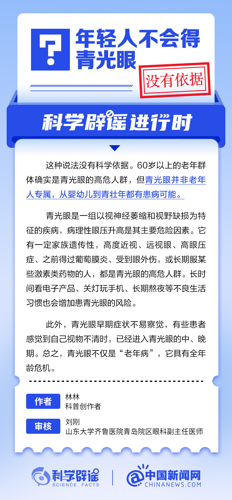 青光眼可發(fā)生于任何年齡,且近年來有年輕化的趨勢(shì)。青光眼早期癥狀不明顯,容易被忽視。一旦出現(xiàn)視力下降、視野缺損等癥狀,往往已經(jīng)發(fā)展到中晚期,錯(cuò)過了最佳治療時(shí)機(jī)。早發(fā)現(xiàn)、早診斷、早治療是控制青光眼病情發(fā)展,保護(hù)視力的關(guān)鍵。(來源:@科學(xué)辟謠 中國(guó)新聞網(wǎng)微博)