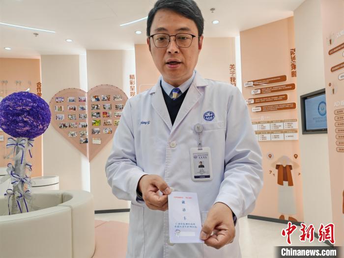 在黃浦區(qū)老年護理醫(yī)院,王剛教授團隊與張揚院長共同制作了就診卡和手環(huán)。就診卡上標明患者在使用單抗,以提醒接診醫(yī)生。(中新網記者 陳靜攝)