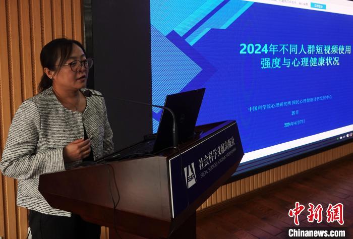 發(fā)布會上,中國科學(xué)院心理研究所助理研究員郭菲解讀“2024年不同人群短視頻使用強(qiáng)度與心理健康狀況”調(diào)查報告。中新網(wǎng)記者 孫自法 攝