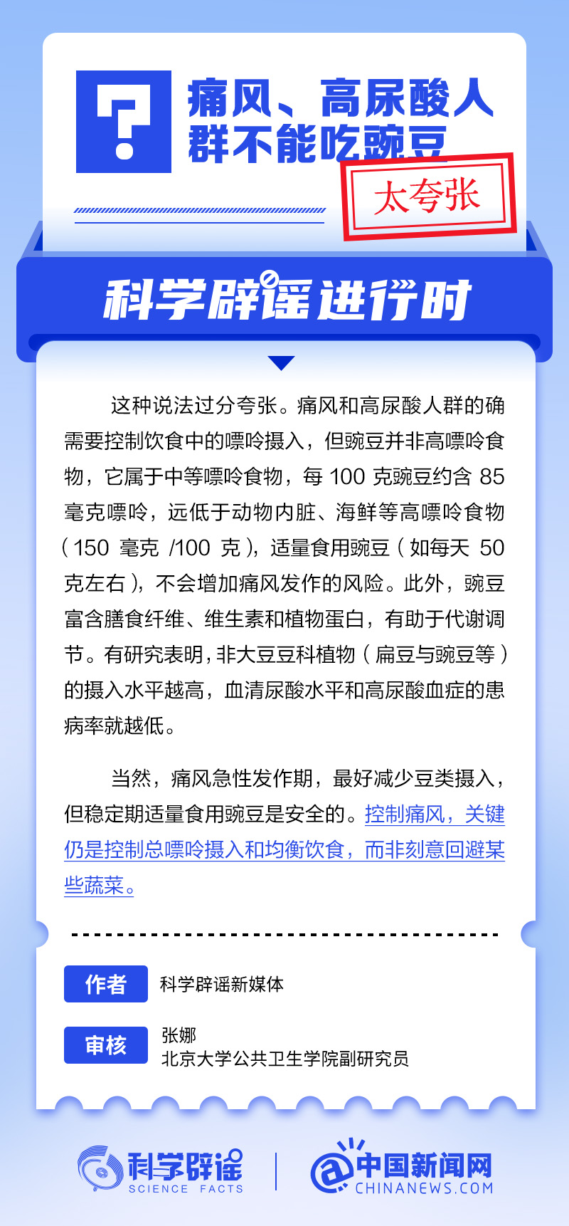 痛風(fēng)和高尿酸人群的確需要控制飲食中的嘌呤攝入,但豌豆并非高嘌呤食物,它屬于中等嘌呤食物,每100克豌豆約含85毫克嘌呤,遠(yuǎn)低于動物內(nèi)臟、海鮮等高嘌呤食物(150毫克/100克),適量食用豌豆(如每天50克左右),不會增加痛風(fēng)發(fā)作的風(fēng)險。此外,豌豆富含膳食纖維、維生素和植物蛋白,有助于代謝調(diào)節(jié)。(來源:@科學(xué)辟謠 中國新聞網(wǎng)微博)