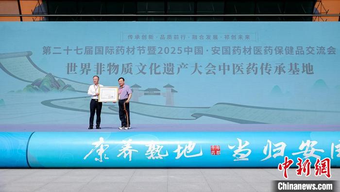 5月25日,安國市獲頒“世界非物質文化遺產(chǎn)大會中醫(yī)藥傳承基地”榮譽證書。賈宗霖 攝