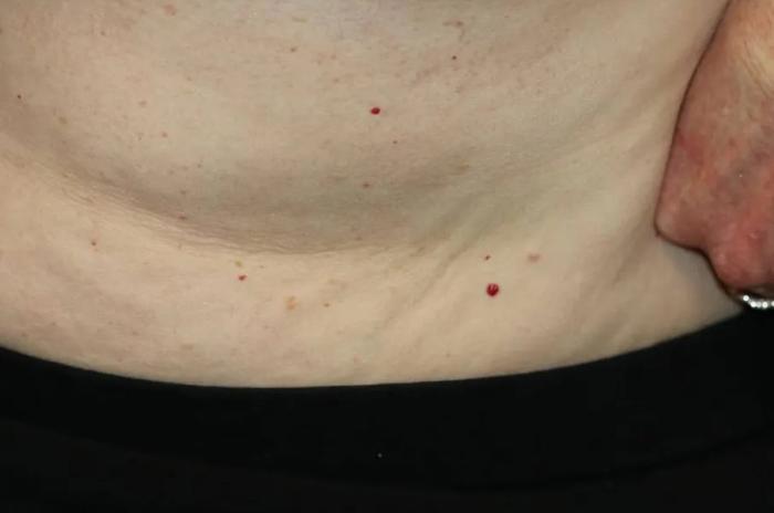 還有一個(gè)值得說的一個(gè)現(xiàn)象,是皮膚長紅痣,也就是散在的小紅點(diǎn),就像下圖這樣。