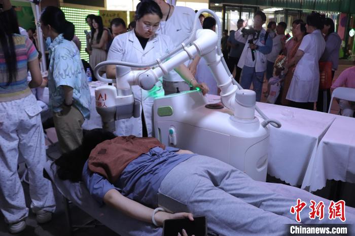 市民正在體驗(yàn)“熱敏灸機(jī)器人”?!⌒苠\陽(yáng) 攝