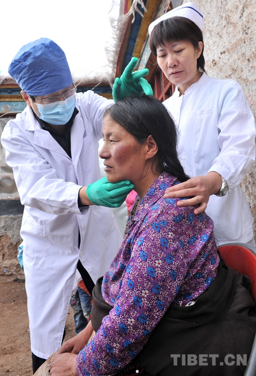 這是曾為斯求卓瑪進(jìn)行手術(shù)的北京口腔醫(yī)院頭頸腫瘤科主任韓正學(xué)(左)到藏北上門(mén)為斯求卓瑪做術(shù)后檢查。(唐召明2015年7月14日攝)