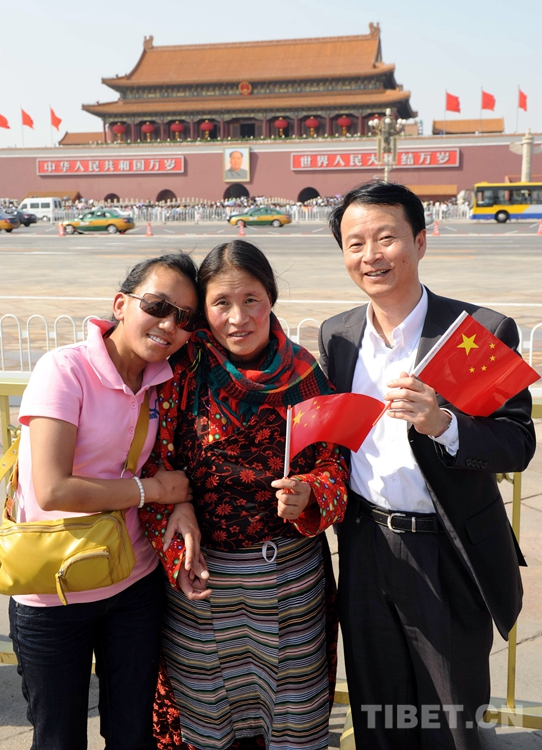 這是斯求卓瑪(中)和藏醫(yī)兼翻譯的旦增達(dá)色(左),以及一直幫助她的中石化首批援藏干部李一超(右)一起在北京天安門(mén)廣場(chǎng)合影留念。(唐召明2010年5月1日攝)