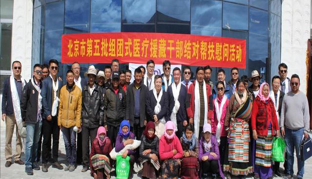 北京市第五批“組團式”援藏醫(yī)療人才開展與當?shù)厝罕娊Y對幫扶活動助力脫貧攻堅。圖為援藏醫(yī)療隊員與當?shù)亟Y對群眾合影。