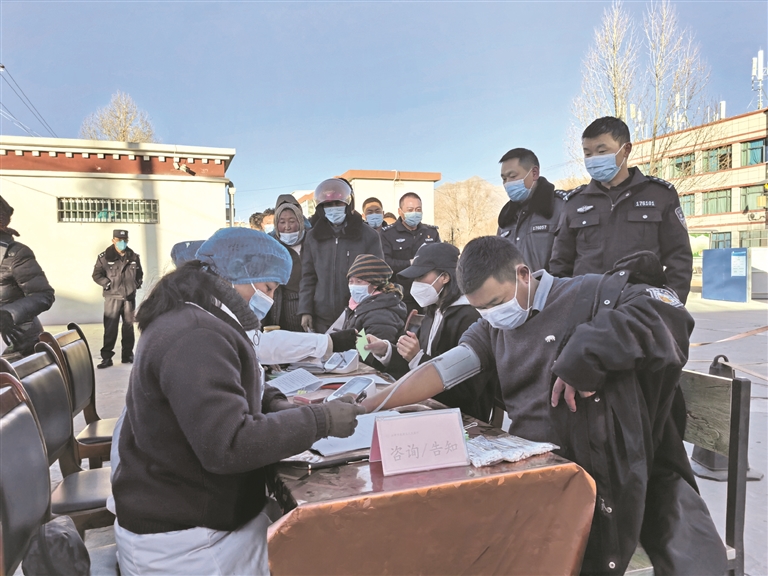 自2021年1月1日起,拉薩市在各縣(區(qū))設(shè)置26個新冠疫苗接種點(diǎn),按照知情同意、自愿接種的原則,優(yōu)先對重點(diǎn)人群進(jìn)行疫苗接種工作。圖為1日上午,在達(dá)孜區(qū)人民醫(yī)院,醫(yī)護(hù)人員正在對公安干警及群眾進(jìn)行血壓檢測和詢問既往病史等,并與他們簽訂新冠病毒疫苗接種同意書。拉薩融媒記者 范江英攝