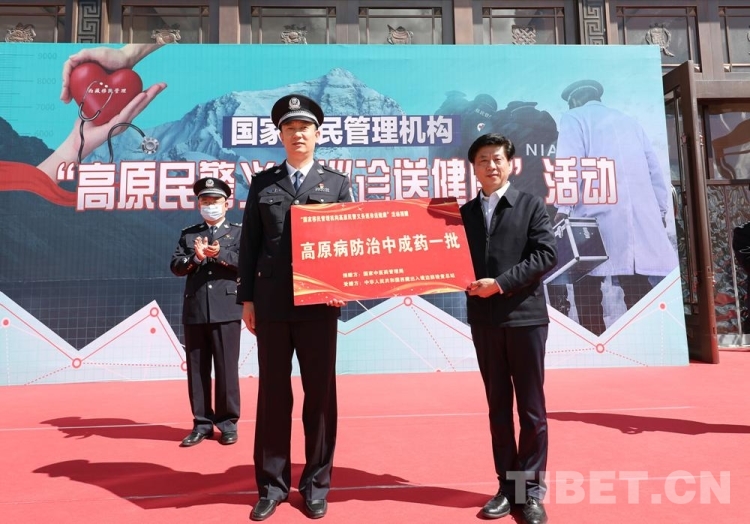 圖為“高原民警義務巡診送健康”活動啟動儀式上,國家中醫(yī)藥管理局為西藏出入境邊防檢查總站贈送一批高原病防治中成藥。 攝影:何宇恒