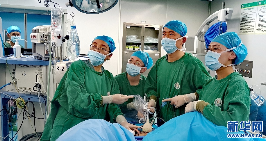 左鵬(右二)在做單孔腹腔鏡下全子宮切除術(shù)教學(xué)手術(shù)