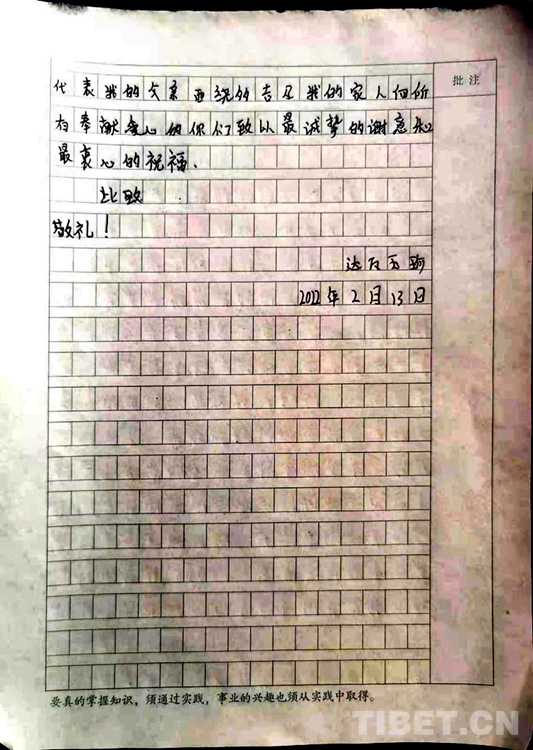 中國(guó)西藏網(wǎng)訊 “親愛(ài)的叔叔、阿姨們,您們好,衷心感謝你們的慷慨解囊和無(wú)私幫助......!”近日,西藏自治區(qū)林芝市巴宜區(qū)更章門巴民族鄉(xiāng)(以下簡(jiǎn)稱:更章鄉(xiāng))門仲村村民西繞多吉女兒達(dá)娃玉珍向更章鄉(xiāng)新時(shí)代文明實(shí)踐所發(fā)來(lái)了一封感謝信,字里行間充滿著感激之情,而背后的暖心故事更讓人溫暖與感動(dòng)。