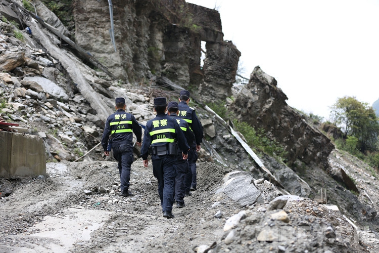圖為屈鵬帶領所屬民警在口岸泥石流地段進行巡邏