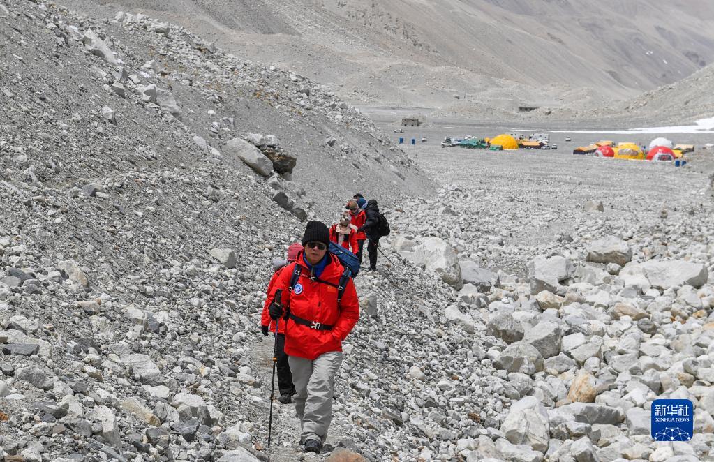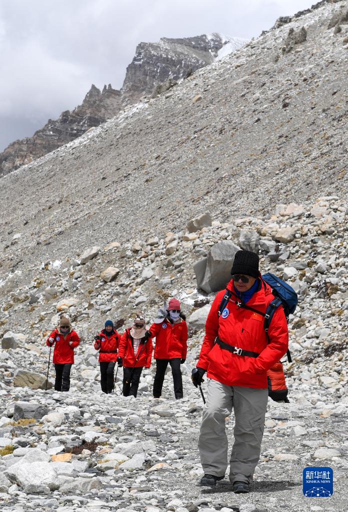 朱彤(右一)和科研人員在珠峰登山大本營和絨布冰川間徒步穿梭(5月1日攝)。新華社記者 姜帆 攝