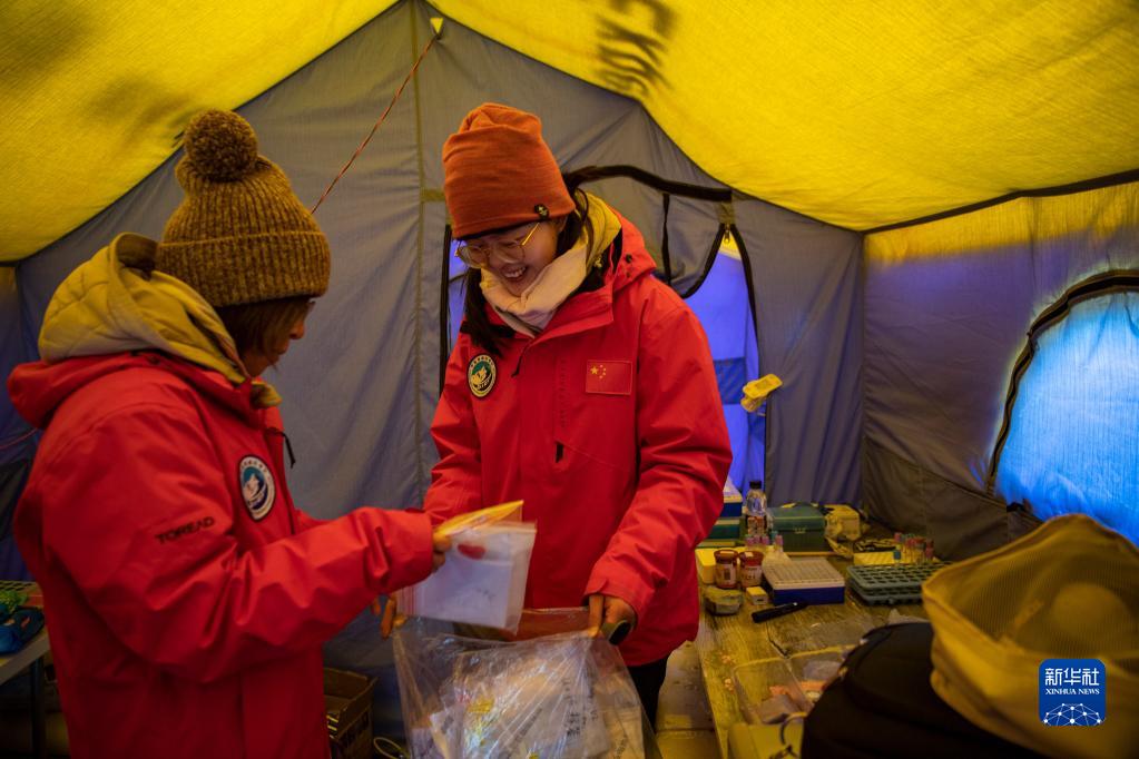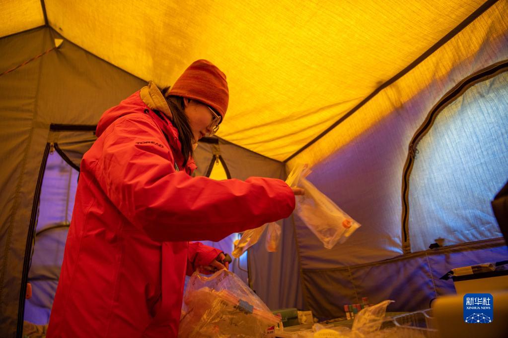 珠峰大氣與人體健康科考分隊成員在整理采集到的樣本(5月1日攝)。新華社記者 李鍵 攝