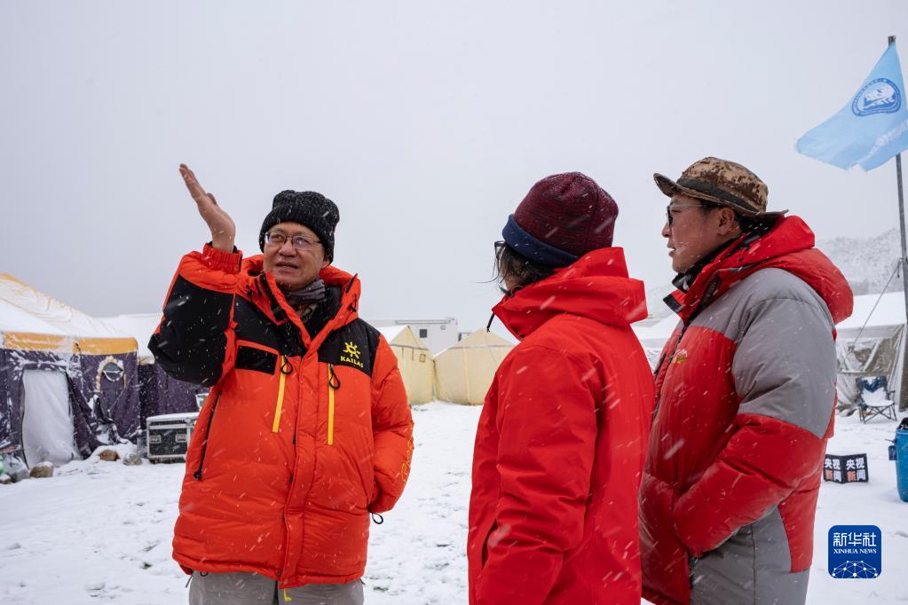 在珠峰登山大本營,朱彤(左)和科研人員交流(4月30日攝)。新華社記者 孫非 攝