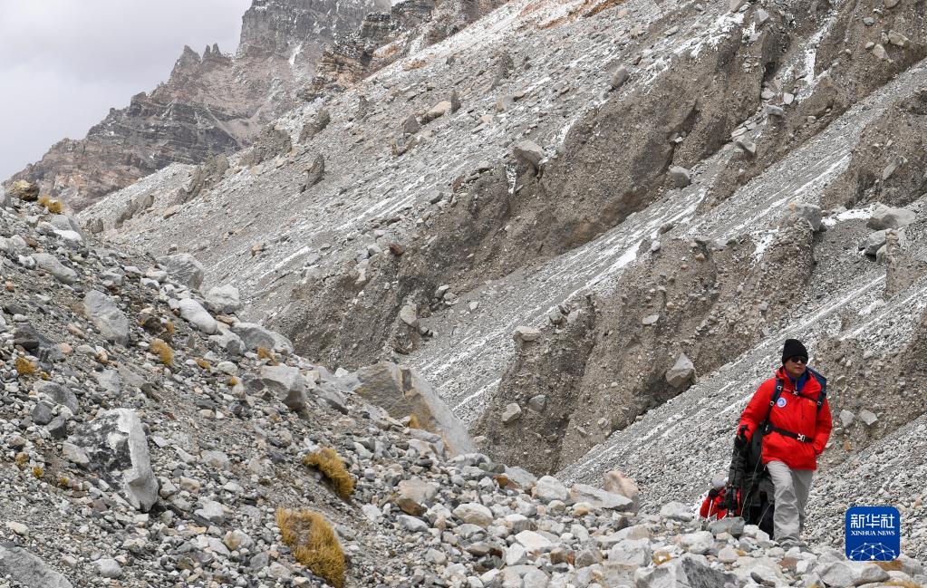 朱彤和科研人員在珠峰登山大本營和絨布冰川間徒步穿梭(5月1日攝)。新華社記者 姜帆 攝