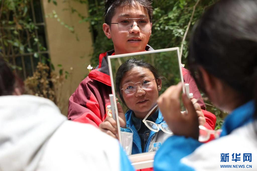 ?在西藏自治區(qū)那曲市色尼區(qū)第二中學(xué)(杭嘉中學(xué)),志愿者狄璐琬正引導(dǎo)戴上試戴架的學(xué)生適應(yīng)眼鏡清晰度(6月22日攝)。新華社發(fā)(趙穎碩 攝)