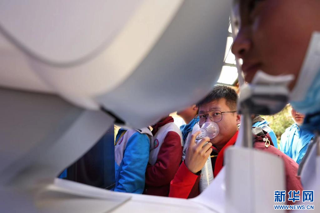 在西藏自治區(qū)那曲市色尼區(qū)第二中學(xué)(杭嘉中學(xué)),志愿者陳坤一邊吸氧一邊為學(xué)生驗光(6月22日攝)。新華社發(fā)(趙穎碩 攝)