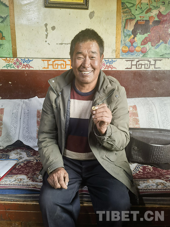 索杰醫(yī)生取出第三個(gè)包的時(shí)候,格外小心翼翼。我們因此也就更好奇,里面又是什么“寶藏”?!拔?986年入黨,1997年當(dāng)村大隊(duì)的副隊(duì)長。2010年,鄉(xiāng)里在12個(gè)村的大隊(duì)長中,選兩名優(yōu)秀人員,我就是其中之一?!彼鹘茚t(yī)生邊說,邊慢慢拿出一個(gè)盒子,打開盒蓋,把手在衣服角上抹抹,然后取出一枚金黃閃亮的毛主席像章?!爱?dāng)時(shí)我們縣一共去了20人,先到那曲市委黨校學(xué)習(xí)了8天,然后到北京和大連分別參觀學(xué)習(xí)7天。在北京,我去了毛主席紀(jì)念堂、天安門、長城、鳥巢、水立方。我在天安門廣場買了鮮花,到毛主席紀(jì)念堂門口時(shí),先是有點(diǎn)緊張,因?yàn)槟抢镎緧彽能娙?。我把鮮花放在一個(gè)統(tǒng)一的地方,瞻仰毛主席遺容時(shí),我緊張的心情一下子沒有了,都變成了激動(dòng)?!彼鹘茚t(yī)生把手放在心臟的位置比劃著,“為了紀(jì)念毛主席,我就買了一枚毛主席像章?!?/p>