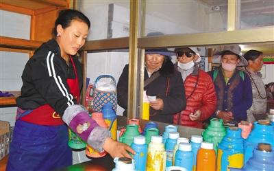 沖賽康“愛心飯館”位于拉薩老城區(qū)核心地帶,因“愛心飯館”飯菜量足、甜茶味道好,深受廣大居民群眾的喜愛。記者來到?jīng)_賽康“愛心飯館”時,飯館內(nèi)早已座無虛席,每個窗口前都排滿了人,廚房內(nèi)的工作人員更是忙得不可開交?!疤鸩枰呀?jīng)賣完了,請稍等一會兒,我們馬上做。”服務(wù)員向客人說道。
