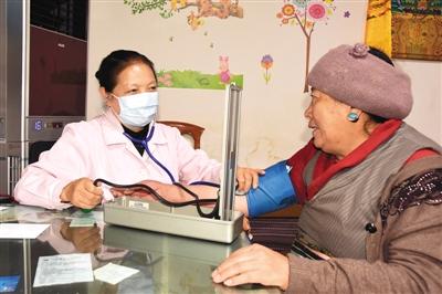 圖為沖賽康社區(qū)居委會“慈愛診所”的卓瑪醫(yī)生免費為轄區(qū)低保困難戶、老人等提供義診服務(wù)。
