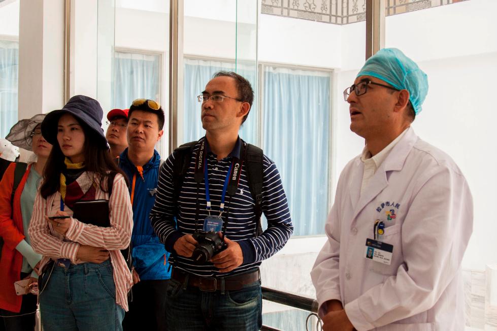 圖為拉薩市人民醫(yī)院重癥醫(yī)學(xué)科主任達瓦向記者們介紹醫(yī)院的援藏情況。