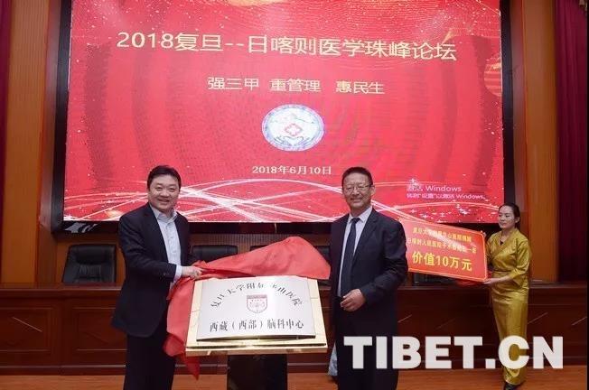 圖為復(fù)旦-日喀則醫(yī)學(xué)高峰論壇上,復(fù)旦大學(xué)附屬華山醫(yī)院副院長(zhǎng)毛穎與日喀則市人民醫(yī)院院長(zhǎng)米瑪多吉一同為腦科疾病診療中心揭牌。日喀則市人民醫(yī)院供圖